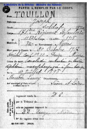 - 30 octobre : Joseph TOUILLON Decize 171e R.I. Decize à l'hôpital n°22 de Decize, maladie contractée en service commandé